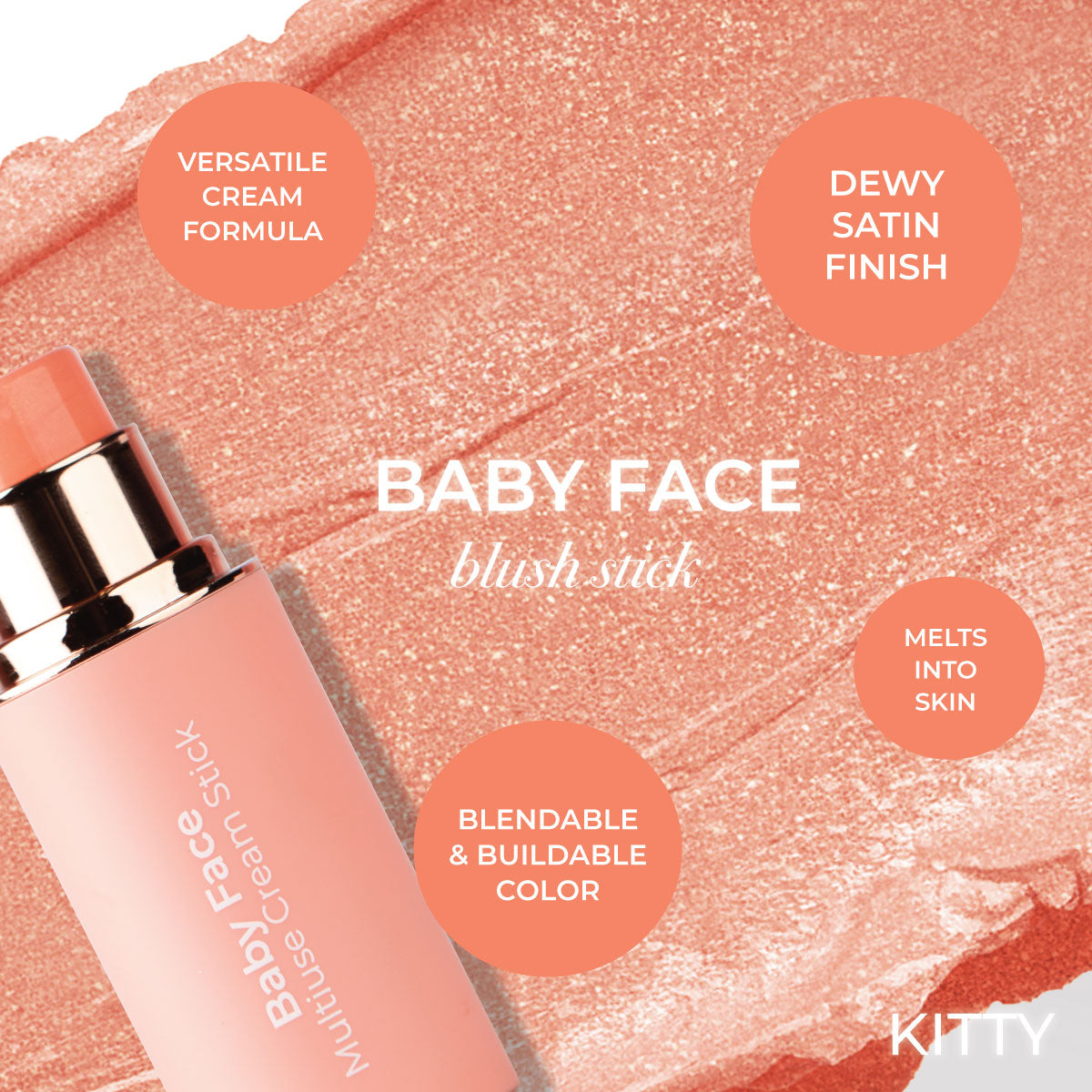 MCoBeauty BABY FACE MULTI-USE CREAM STICK melts effortlessly onto the sin. creating the perfect fresh faced radiant glow. The weightless creamy formula. glides seamlessly onto the skin for a lightweight. flush of color. Formulated with Jojoba Oil and Coconut Oil to soothe skin and balance moisture. creating natural-looking. healthy glow. With multiple flattering shades to compliment all skin tones. simply swipe on cheeks and lips for a soft pop of color or build up for a more vivid look.