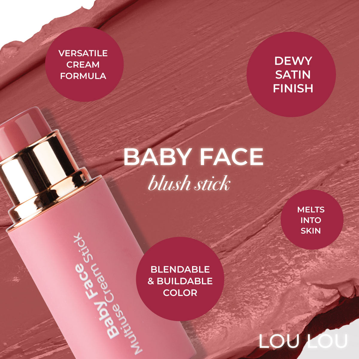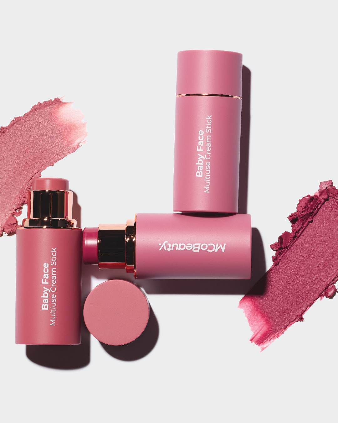 MCoBeauty BABY FACE MULTI-USE CREAM STICK melts effortlessly onto the sin. creating the perfect fresh faced radiant glow. The weightless creamy formula. glides seamlessly onto the skin for a lightweight. flush of color. Formulated with Jojoba Oil and Coconut Oil to soothe skin and balance moisture. creating natural-looking. healthy glow. With multiple flattering shades to compliment all skin tones. simply swipe on cheeks and lips for a soft pop of color or build up for a more vivid look.