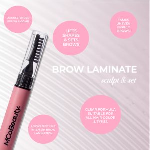 Give yourself the illusion of a salon brow lamination with the MCoBeauty BROW LAMINATE SCULPT & SET tool. This unique and innovative formula. a flawless fusion of gel and wax. keeps brows firmly in place all day long. while allowing you to style and set any brow look. from natural and fluffy to laminated and bold.