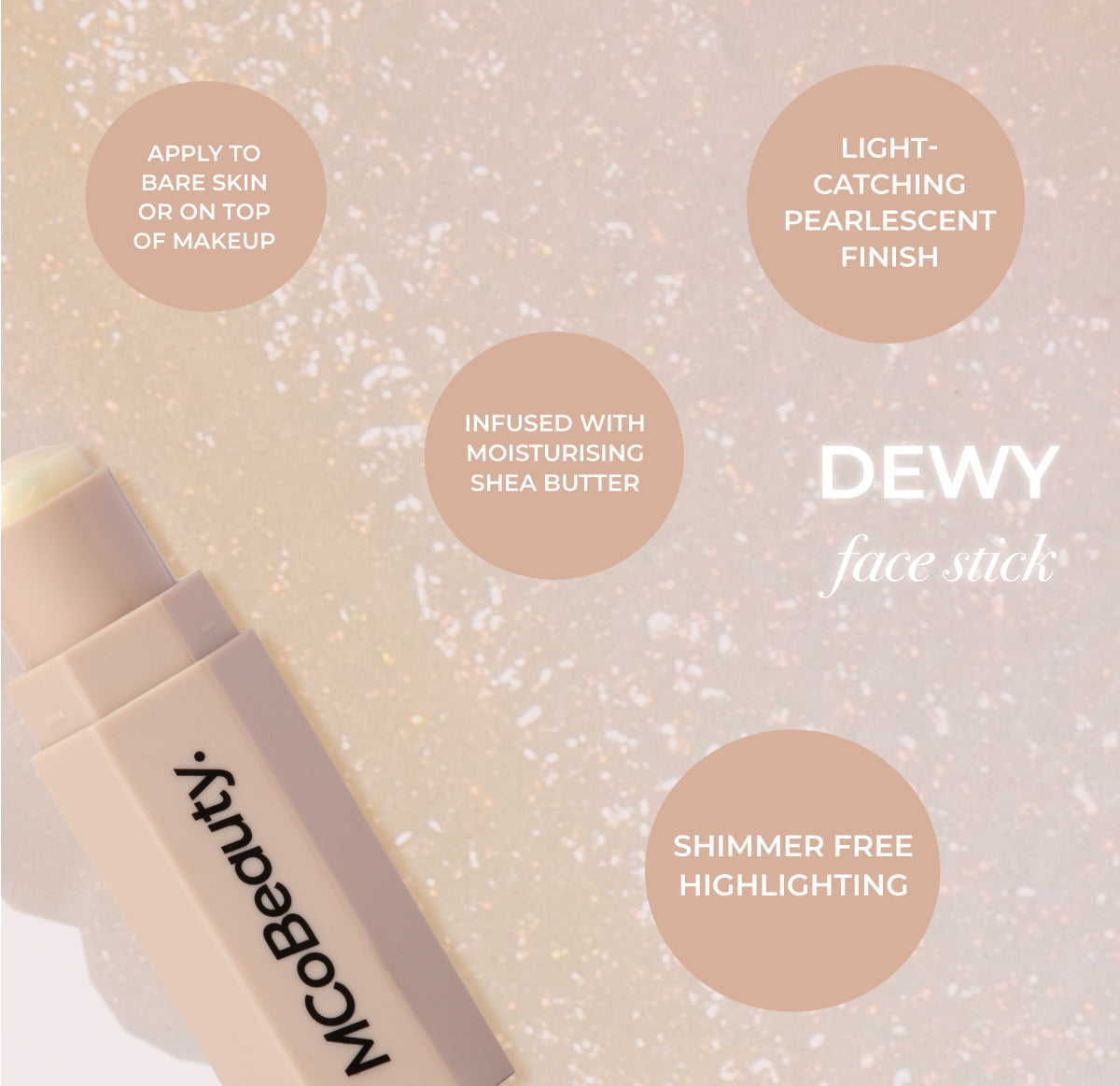 MCoBeauty DEWY FACE STICK impacts a natural-looking glass-like pearlescent glow without the sparkle or glitter. This lightweight formula glides seamlessly onto skin to take your dewy makeup look to the next level. Use this velvety stick to highlight and enhance the skin – either on a fresh face. or layered over makeup for a healthy glowing second-skin finish.