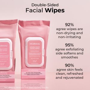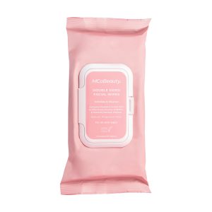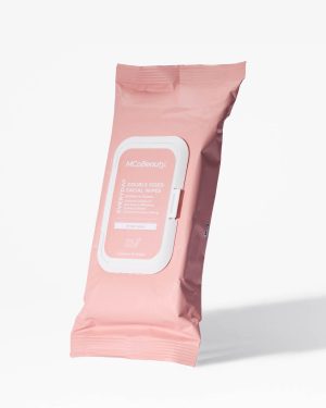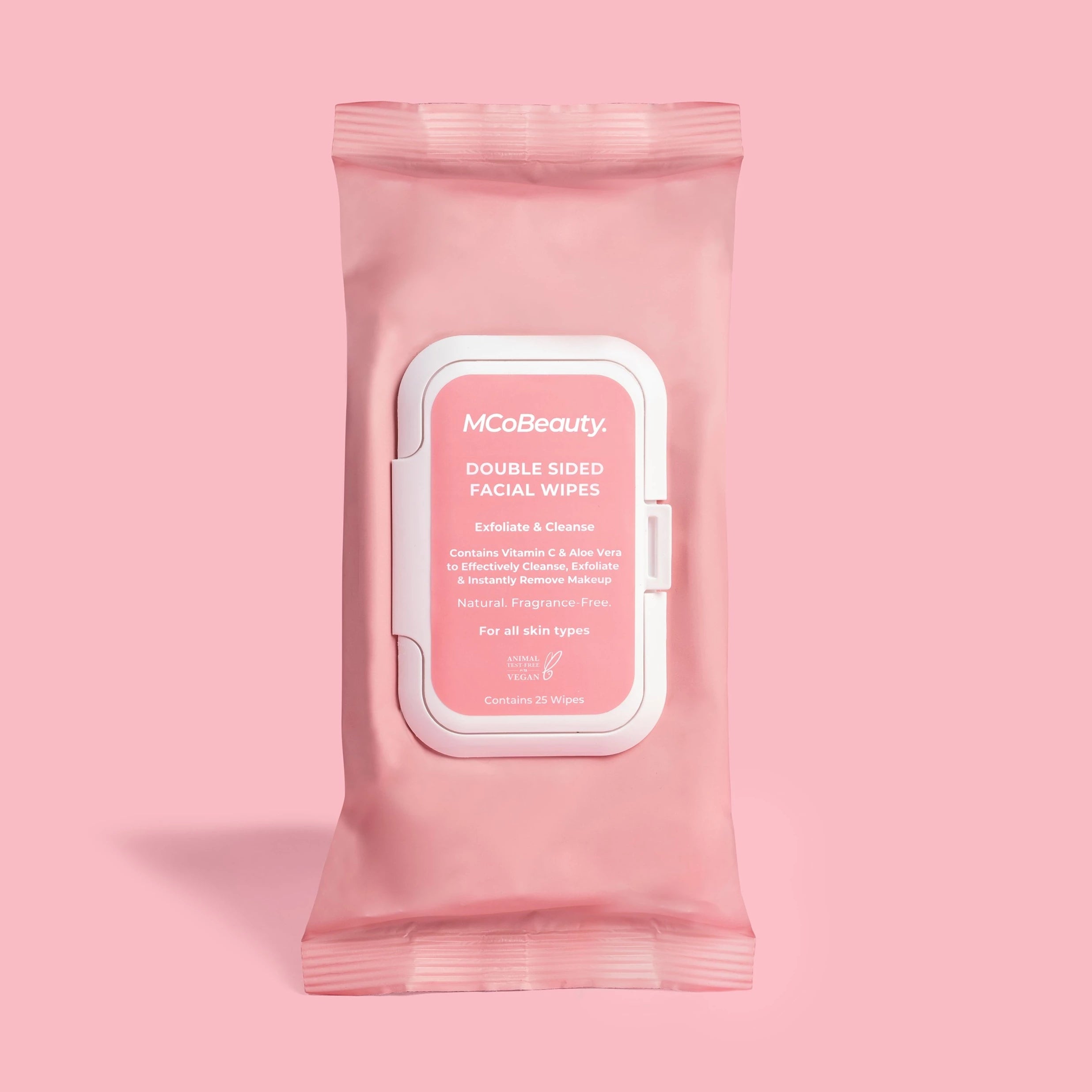The MCoBeauty DOUBLE-SIDED FACIAL WIPES are a convenient pack of 25 double-sided beauty wipes to effectively cleanse. exfoliate and instantly remove makeup for ultra-clean. glowing skin. The soft side acts as the perfect cleansing tool. while the exfoliating side removes dead skin cells to create a smooth. soft complexion. This multi-tasking wipe is ideal for travel. gym bags and on the go for an instant refresh.