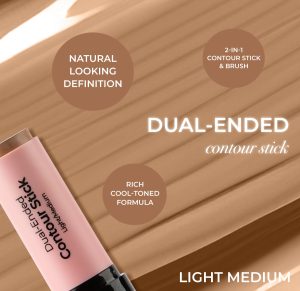 MCoBeauty DUAL-ENDED CONTOUR STICK invites you to enter the world of contouring with just a few simple steps ??no expertise required! This rich. cool-toned formula has been cleverly designed in a stick format. allowing the perfect targeted application to lift and define effortlessly. Created to layer. the lightweight. creamy texture glides on and stays buttery once applied. allowing time to buff to a soft matte finish before setting. The included angled brush blends seamlessly allowing full control to build a naturally sculpted effect for added dimension.