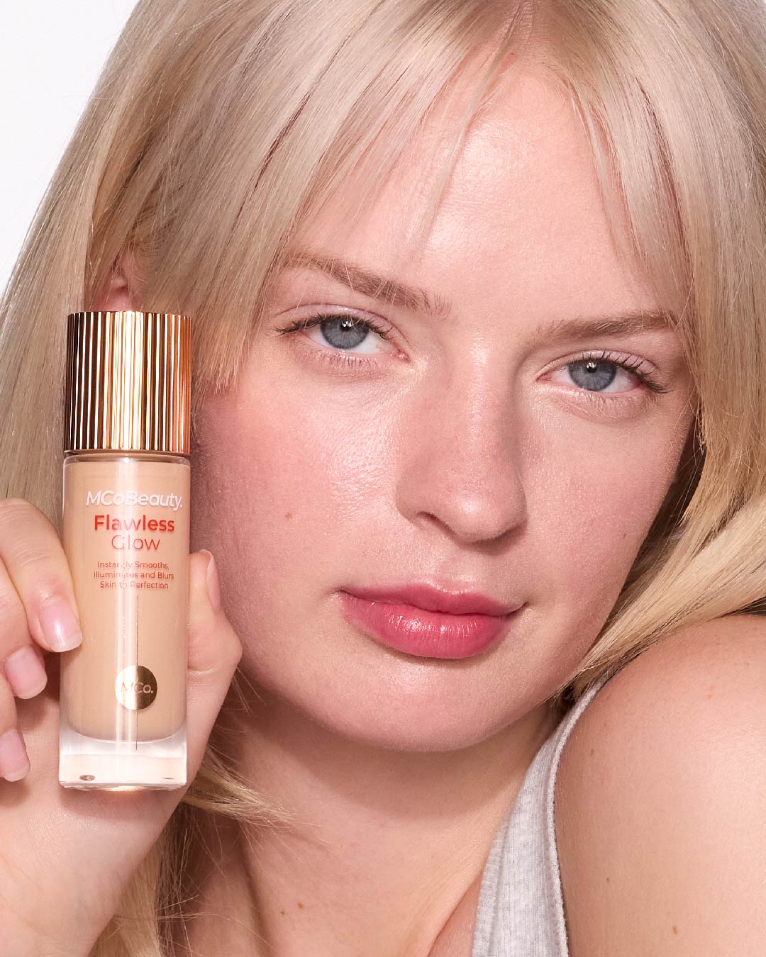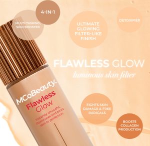 MCoBeauty FLAWLESS GLOW LUMINOUS SKIN FILTER is a 4-in-1. multi-tasking skin booster designed to give your skin the ultimate glowing. filter-like perfection. in a bottle! Designed to be worn alone for a lightweight subtle glow. under makeup as a luminous primer. mixed with foundation to add a light-reflecting glow. or on top of makeup as highlighter.