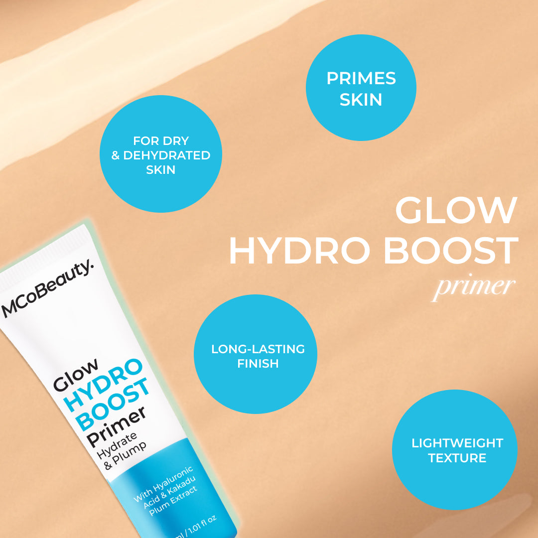 MCoBeauty GLOW HYDRO BOOST PRIMER is a hydrating primer to help create a plump-looking base for your makeup. The extra nourishing formula assists with smoothing the look of your complexion. while Hyaluronic Acid and Kakadu Plum Extract help your skin feel supple and moisturized.