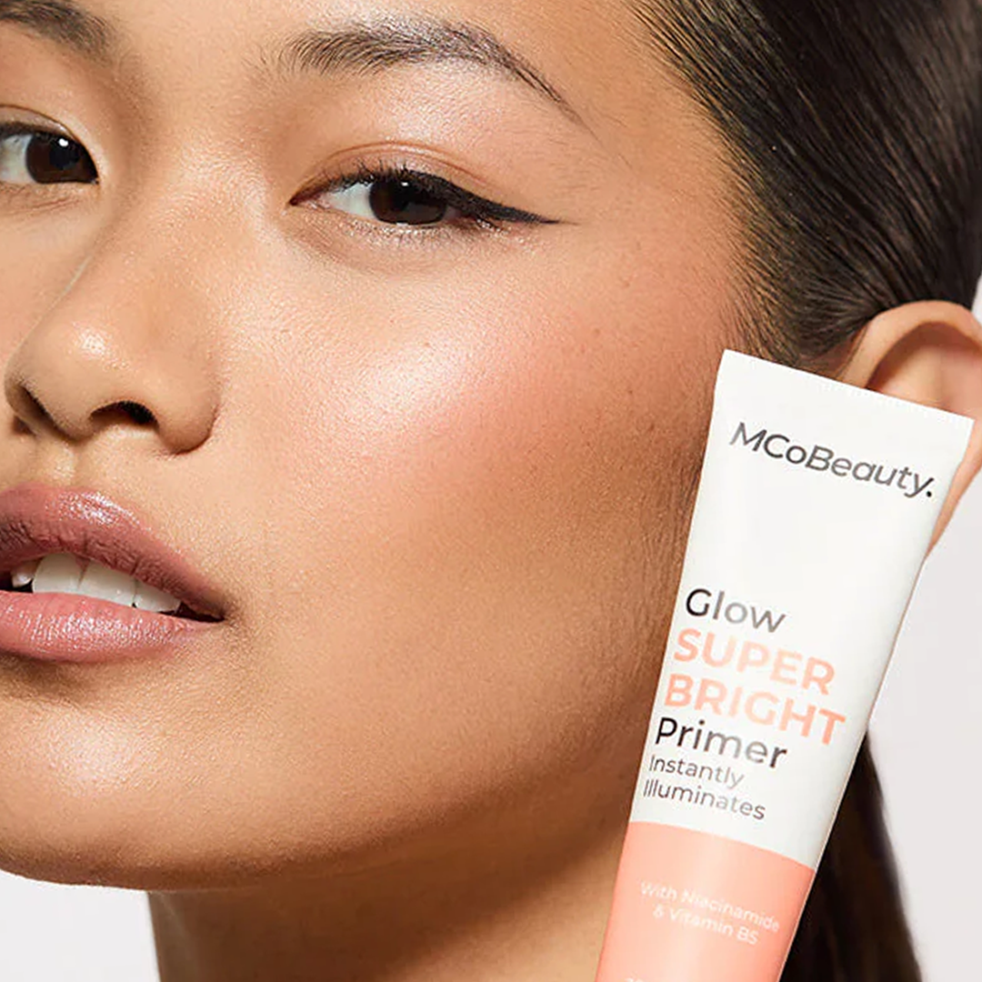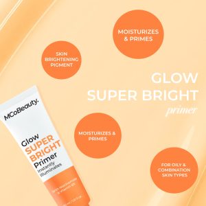 MCoBeauty GLOW SUPER BRIGHT PRIMER works instantly to give your complexion a lit-from-within glow to create the perfect. long-lasting radiant base for all-day makeup wear. Suitable for combination and oily skin types. this skincare infused primer contains light reflecting particles to smooth and illuminate skin in just one step for a subtle. radiant glow. Enriched with Niacinamide & Panthenol. this lightweight primer works to reduce the appearance of blemishes for dewy skin. to help you glow from inside and out. More than just another step in your makeup routine. this skincare-makeup hybrid is the perfect priming base for all your beauty needs!