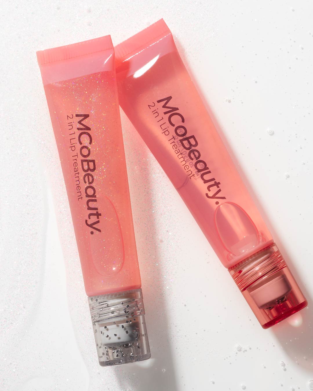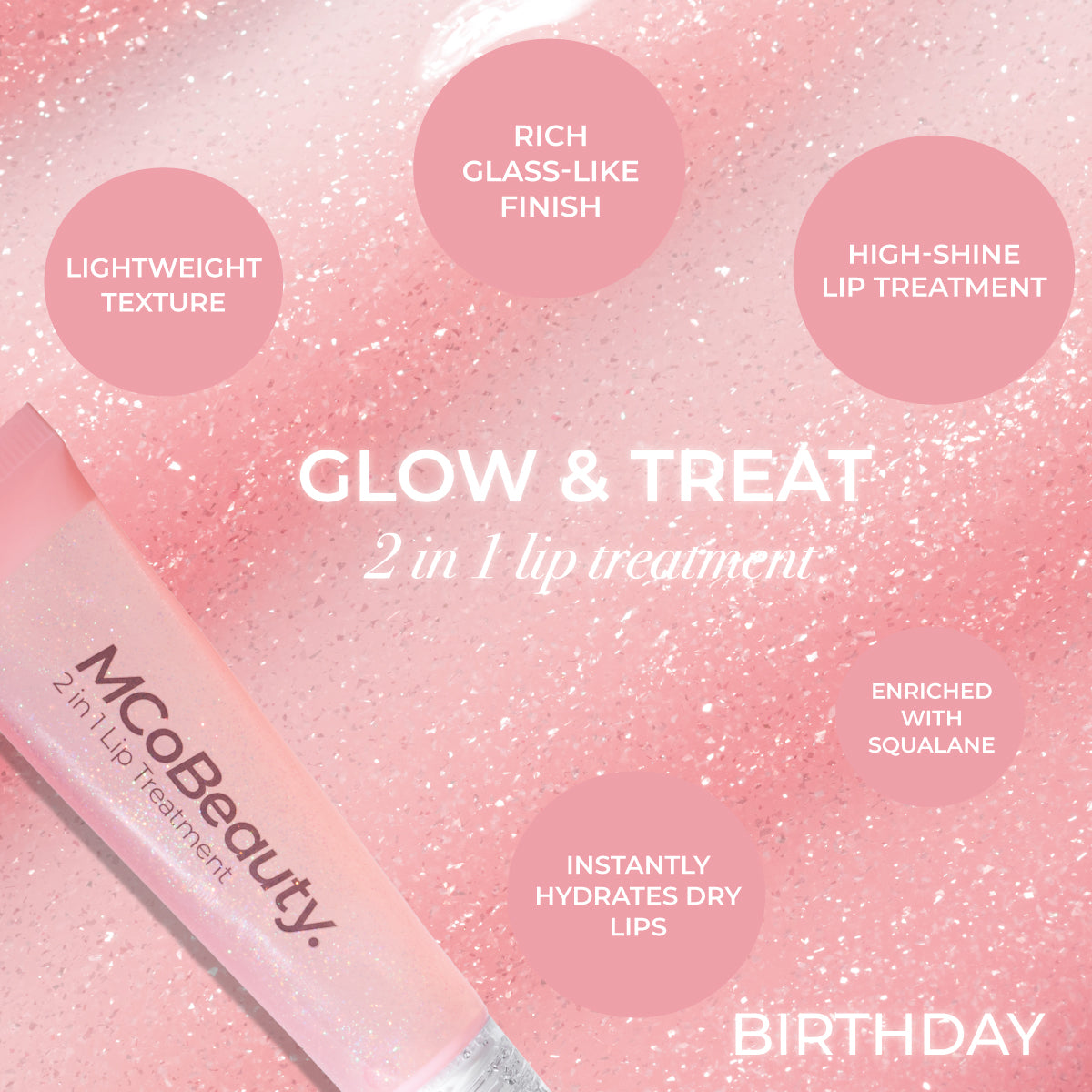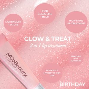 Say goodbye to dry. chapped lips with the MCoBeauty GLOW & TREAT 2-IN-1 LIP TREATMENT. This luxurious lip treatment is enriched with plant-derived squalane to hydrate and nourish. providing instant relief while delivering a rich. high-shine finish. The roller ball applicators gently massage your lips while dispensing the ideal amount of product to coat your lips with moisturizing shine. Available in multiple delicious scents. these treatments can be worn on their own or over other lip products for a glassy finish.