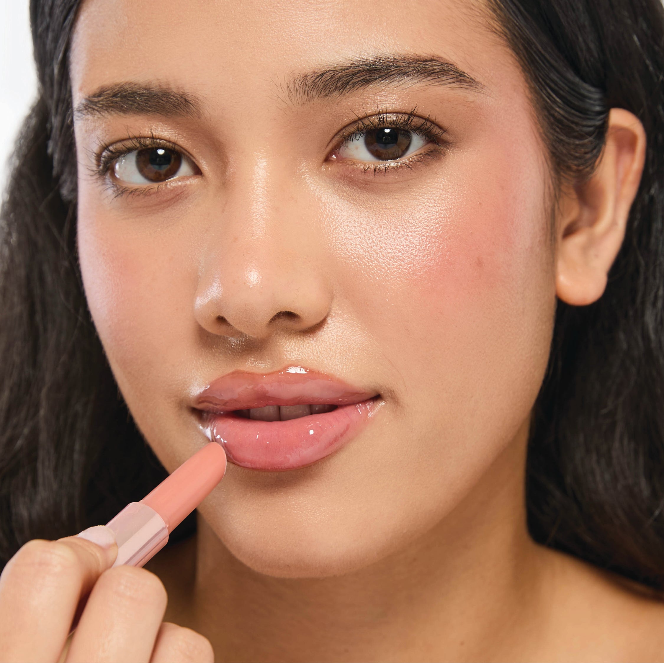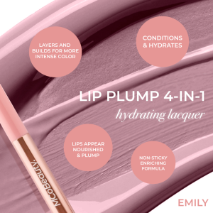 MCoBeauty LIP PLUMP 4-IN-1 HYDRATING LACQUER is a revitalizing lip treatment that melts instantly on contact with your lips. An instant moisture sensation. infused with luxurious fruit extracts. this lacquer combines the nourishment of a balm with the buildable tint of a lipstick. The plumping. glistening finish starts as a sheer tint of color upon application but can easily transform into an opaque lacquer after applying two to three coats. Lips are left coated in a veil of power-house ingredients including Shea Butter. Hyaluronic Acid and Vitamin E in combination with a cooling sensation. The non-retractable packaging ensures your lacquer applies the perfect amount of melting product every time.