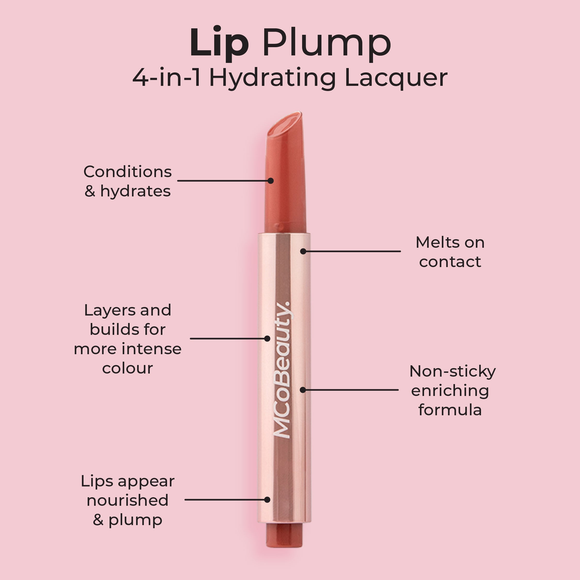 MCoBeauty LIP PLUMP 4-IN-1 HYDRATING LACQUER is a revitalizing lip treatment that melts instantly on contact with your lips. An instant moisture sensation. infused with luxurious fruit extracts. this lacquer combines the nourishment of a balm with the buildable tint of a lipstick. The plumping. glistening finish starts as a sheer tint of color upon application but can easily transform into an opaque lacquer after applying two to three coats. Lips are left coated in a veil of power-house ingredients including Shea Butter. Hyaluronic Acid and Vitamin E in combination with a cooling sensation. The non-retractable packaging ensures your lacquer applies the perfect amount of melting product every time.