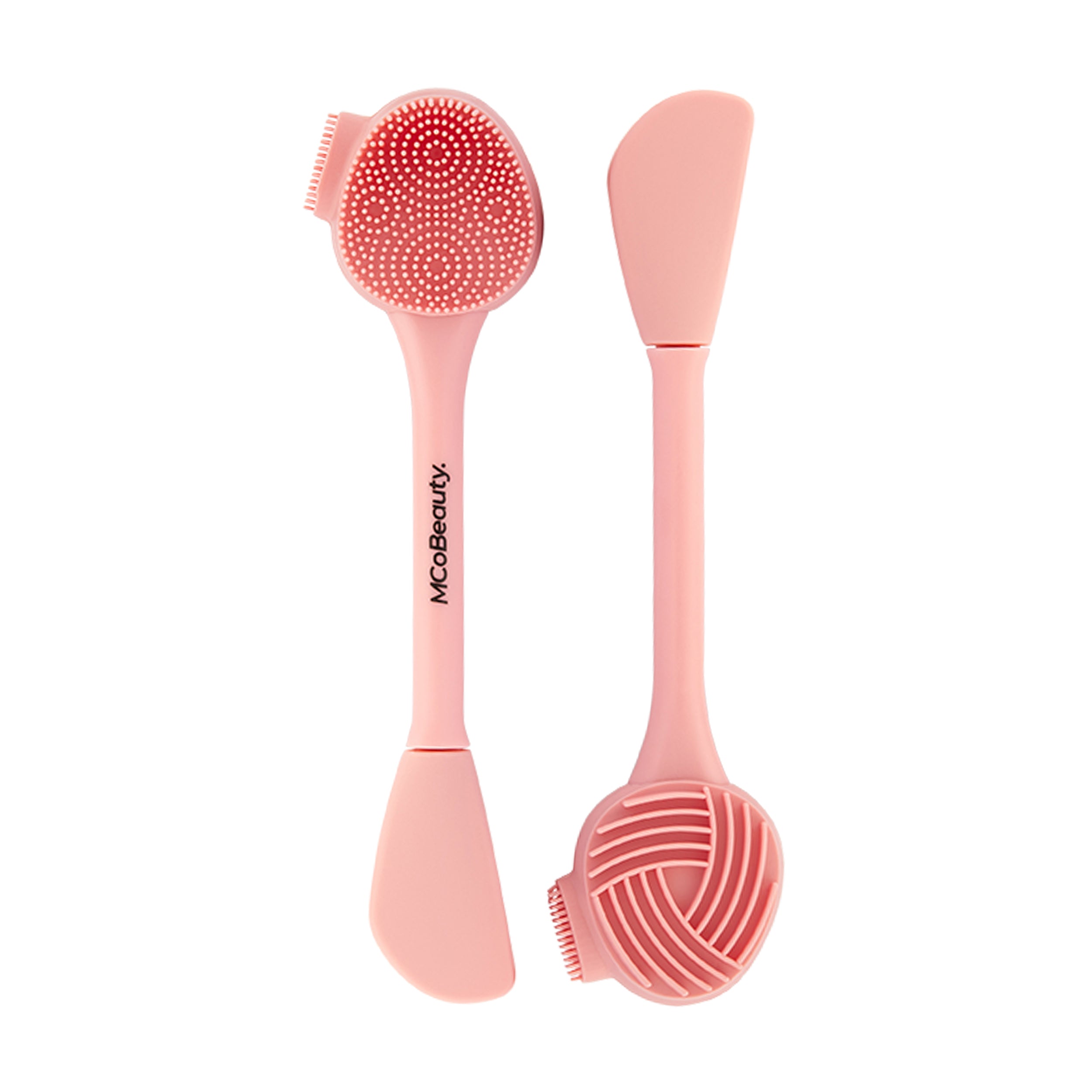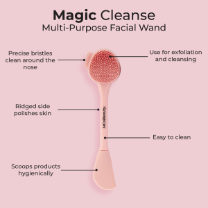 MCoBeauty MAGIC CLEANSE MULTI-PURPOSE FACIAL WAND is the ultimate cleansing companion. The multi-sided wand hygienically scoops your skincare products up. before the soft bristles gently cleanse your face. The precise bristles on the side of the wand are ideal for cleansing around the nose and other facial areas. For a deeper exfoliation. flip it over to the deeply ridged side to thoroughly polish your skin. Your skin will be left feeling cleansed. soft. and refreshed.