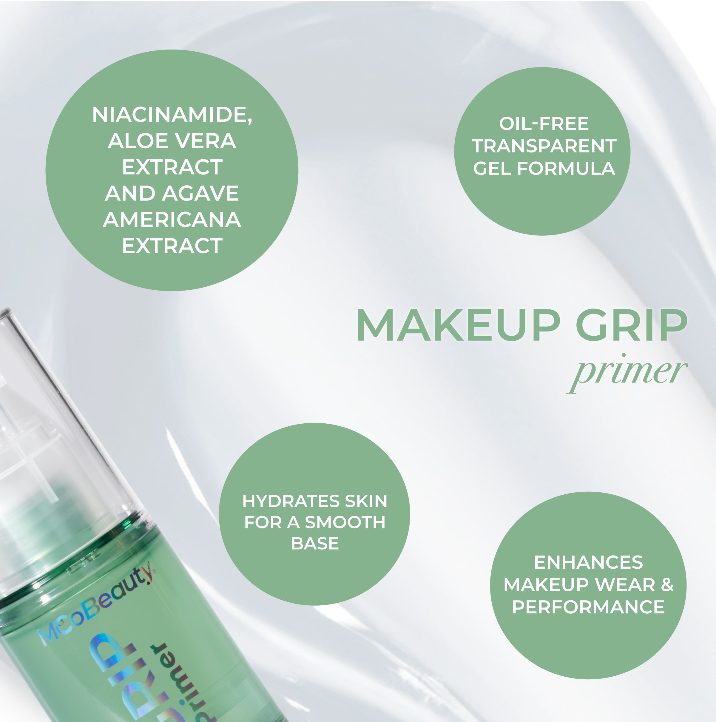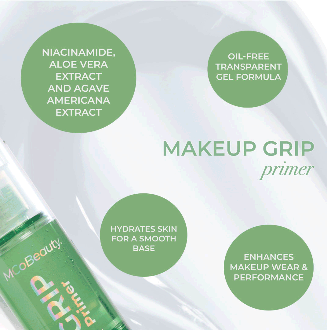 MCoBeauty MAKEUP GRIP PRIMER is an advanced formula that allows you to build a longwearing base for your makeup look with its innovative gripping technology. The unique. lightweight gel texture gently fills pores and smooths skin to create an even base. blurring the look of imperfections while allowing your base makeup to stay put. Enriched with Aloe Vera Extract. Niacinamide and Agave Americana Leaf Extract. starting your routine with this water-based gel primer ensures skin is hydrated. nourished and protected underneath your makeup.
