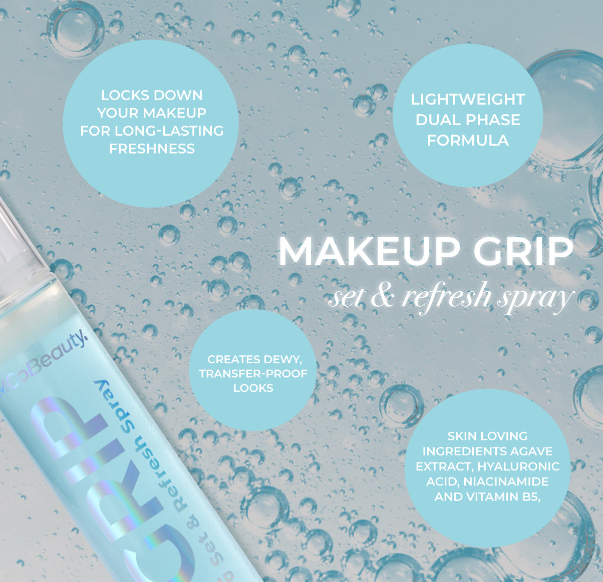 MCoBeauty MAKEUP GRIP SET & REFRESH SPRAY is your makeup must-have for dewy. transfer-proof looks. This lightweight. dual-phase formula locks down your makeup for long-lasting freshness. reducing the need for touch-ups. With skin loving ingredients Agave Extract. Hyaluronic Acid. Niacinamide and Vitamin B5. this weightless mist envelops the complexion in a veil of rejuvenating hydration for the ultimate radiant finish. For an extra dose of moisture. refresh and revitalize your face with just a few spritzes whenever you. or your skin are in need of a pick-me-up.