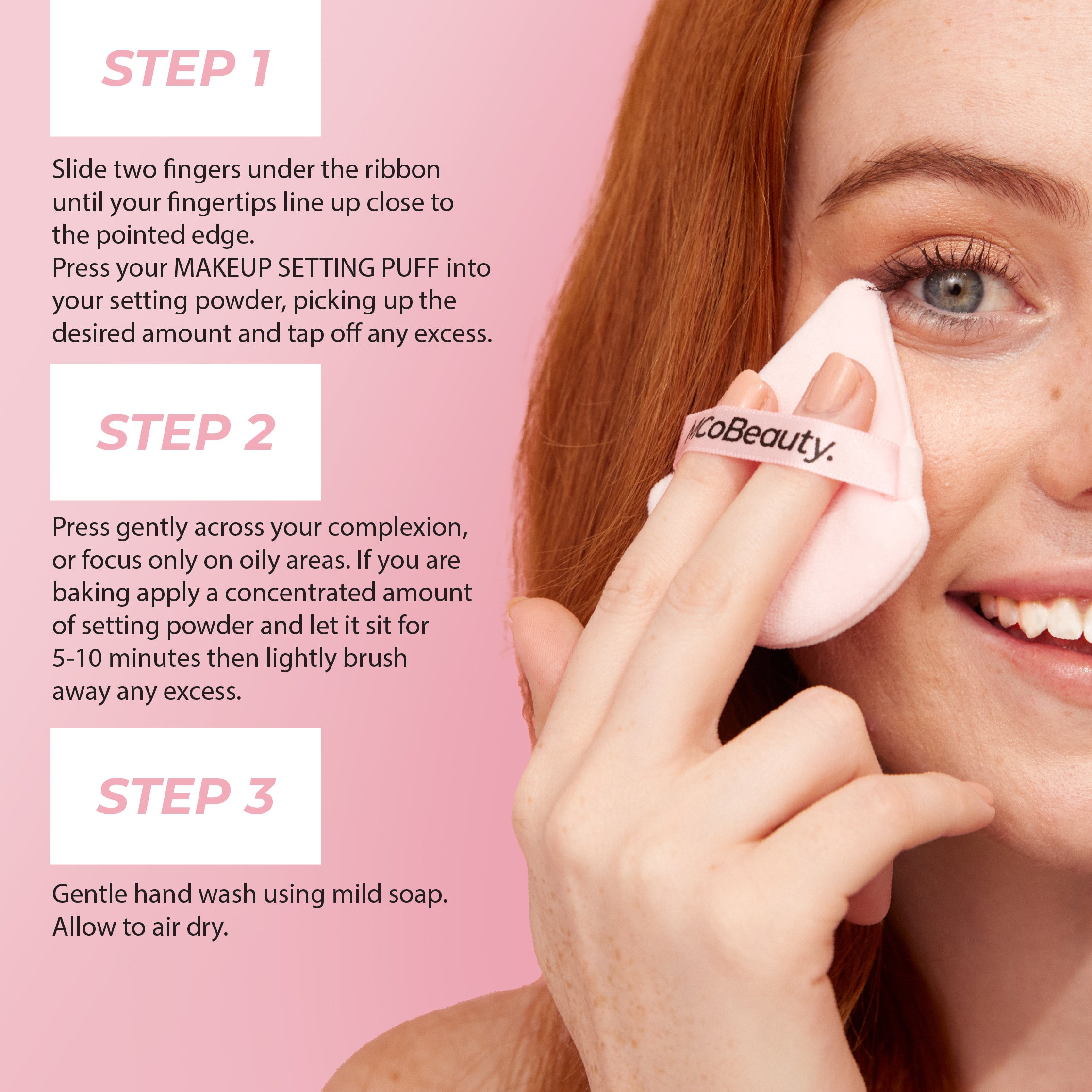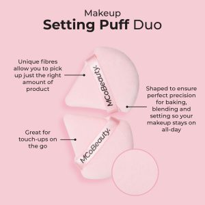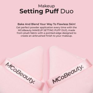 Get the perfect powder application every time with the MCoBeauty MAKEUP SETTING PUFF DUO. These soft. plush fabric puffs feature a pointed edge designed to create an airbrushed finish. A must-have essential. these puffs are perfect for precise application to bake and set under eyes. contour cheekbones & reach smaller areas of the face.