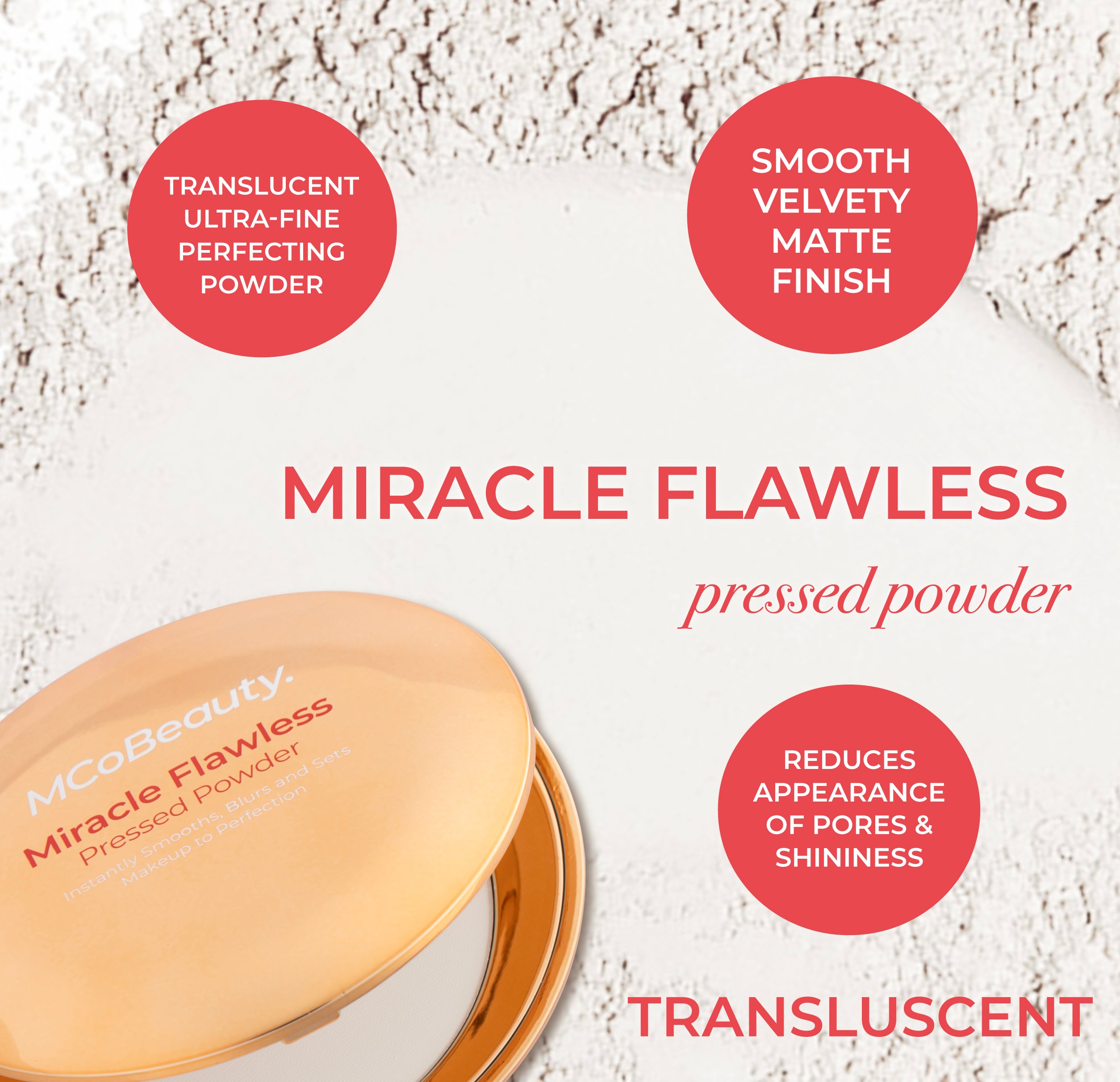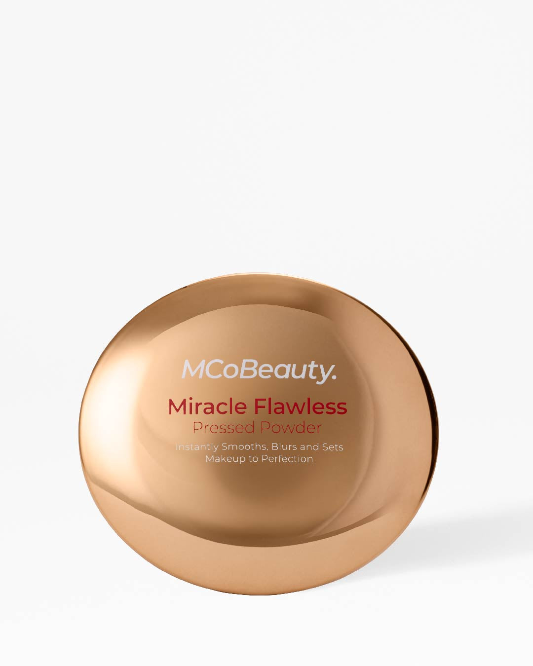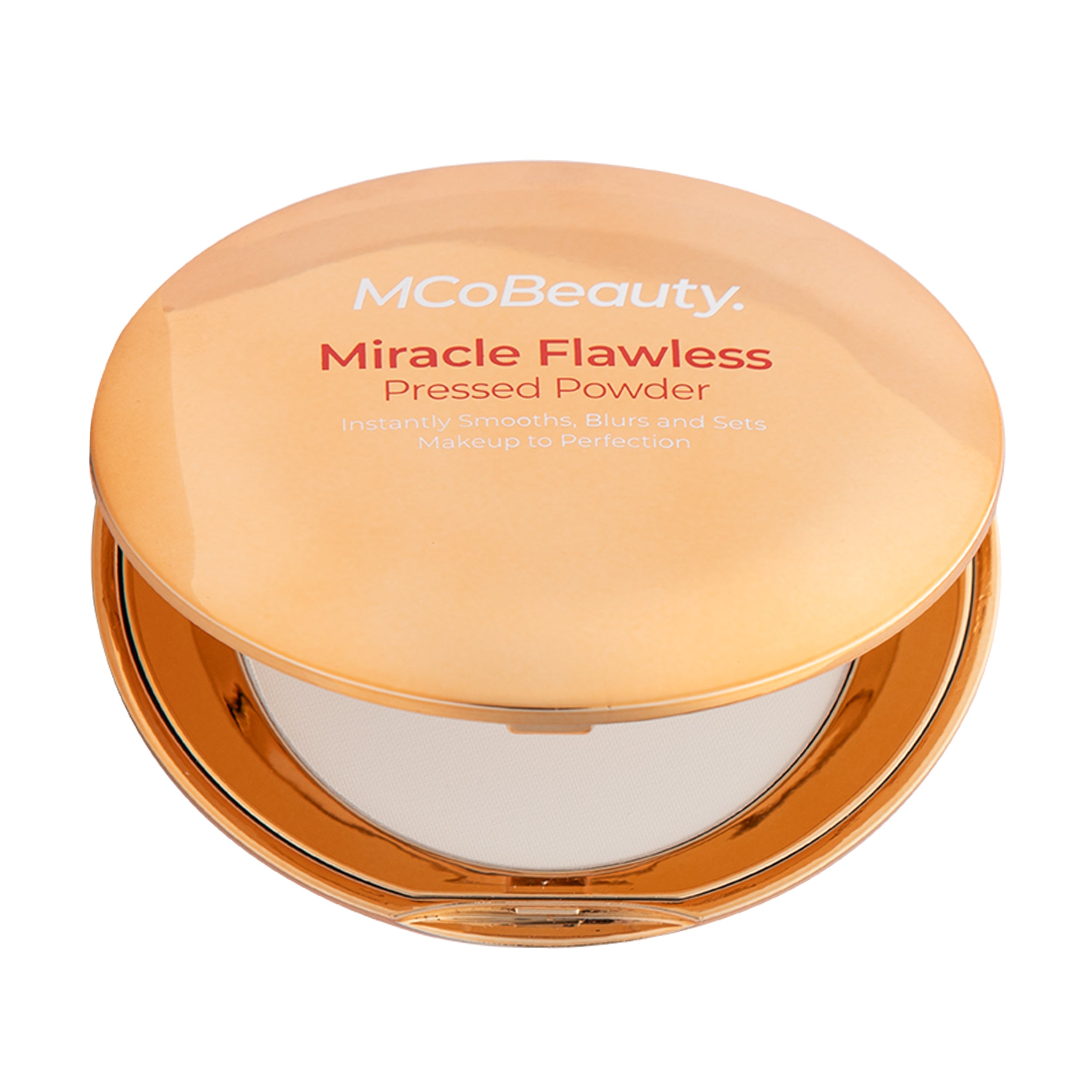 MCoBeauty MIRACLE FLAWLESS PRESSED POWDER is an ultra-fine finishing powder that delivers unbeatable wear to visibly reduce shine with a mattifying effect. Rose Flower Extract and Sweet Almond Oil hydrate and help soothe while a blend of superfine particles double down on smoothing the look of skin texture. pores. fine lines and imperfections. The formula applies translucent. without disrupting your products underneath – the perfect complexion enhancer!