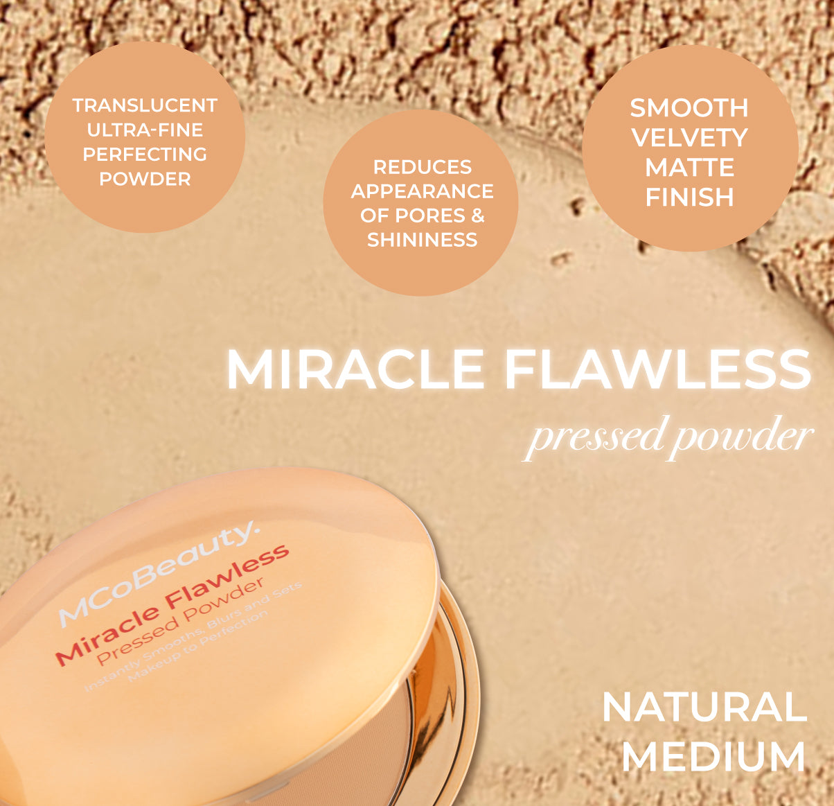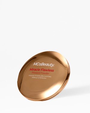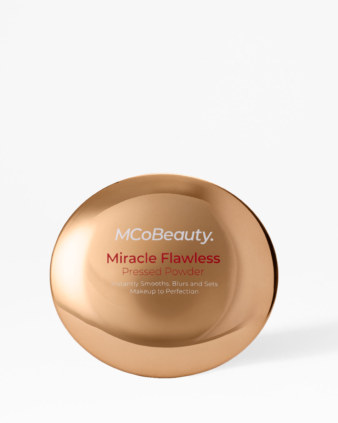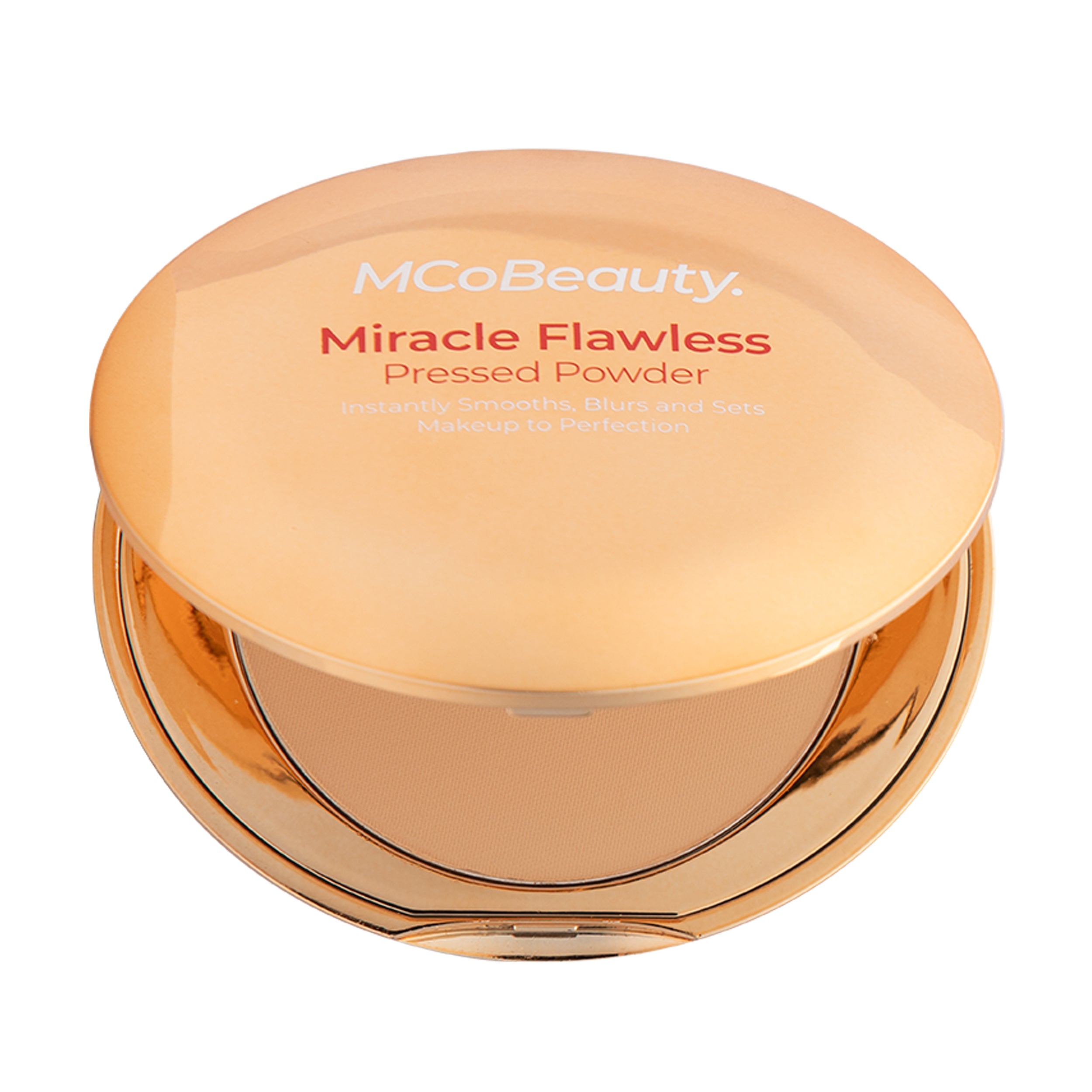MCoBeauty MIRACLE FLAWLESS PRESSED POWDER is an ultra-fine finishing powder that delivers unbeatable wear to visibly reduce shine with a mattifying effect. Rose Flower Extract and Sweet Almond Oil hydrate and help soothe while a blend of superfine particles double down on smoothing the look of skin texture. pores. fine lines and imperfections. The formula applies a sheer veil of color. without disrupting your products underneath – the perfect complexion enhancer!