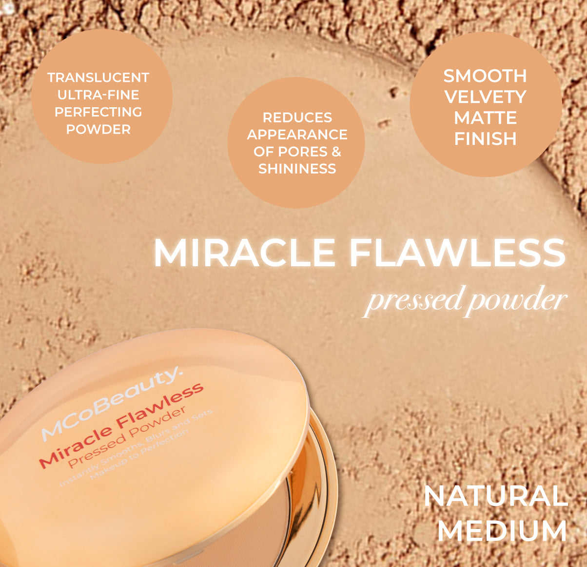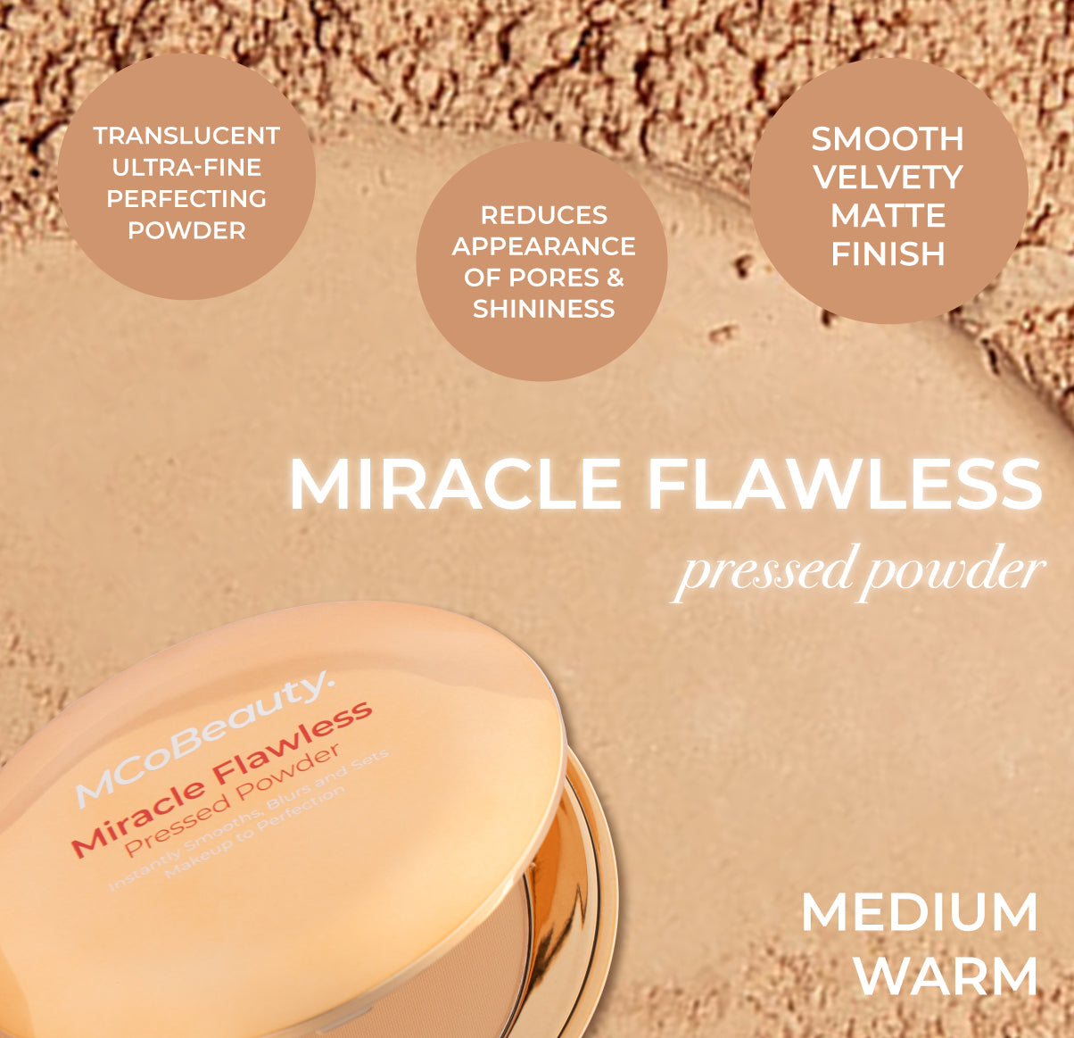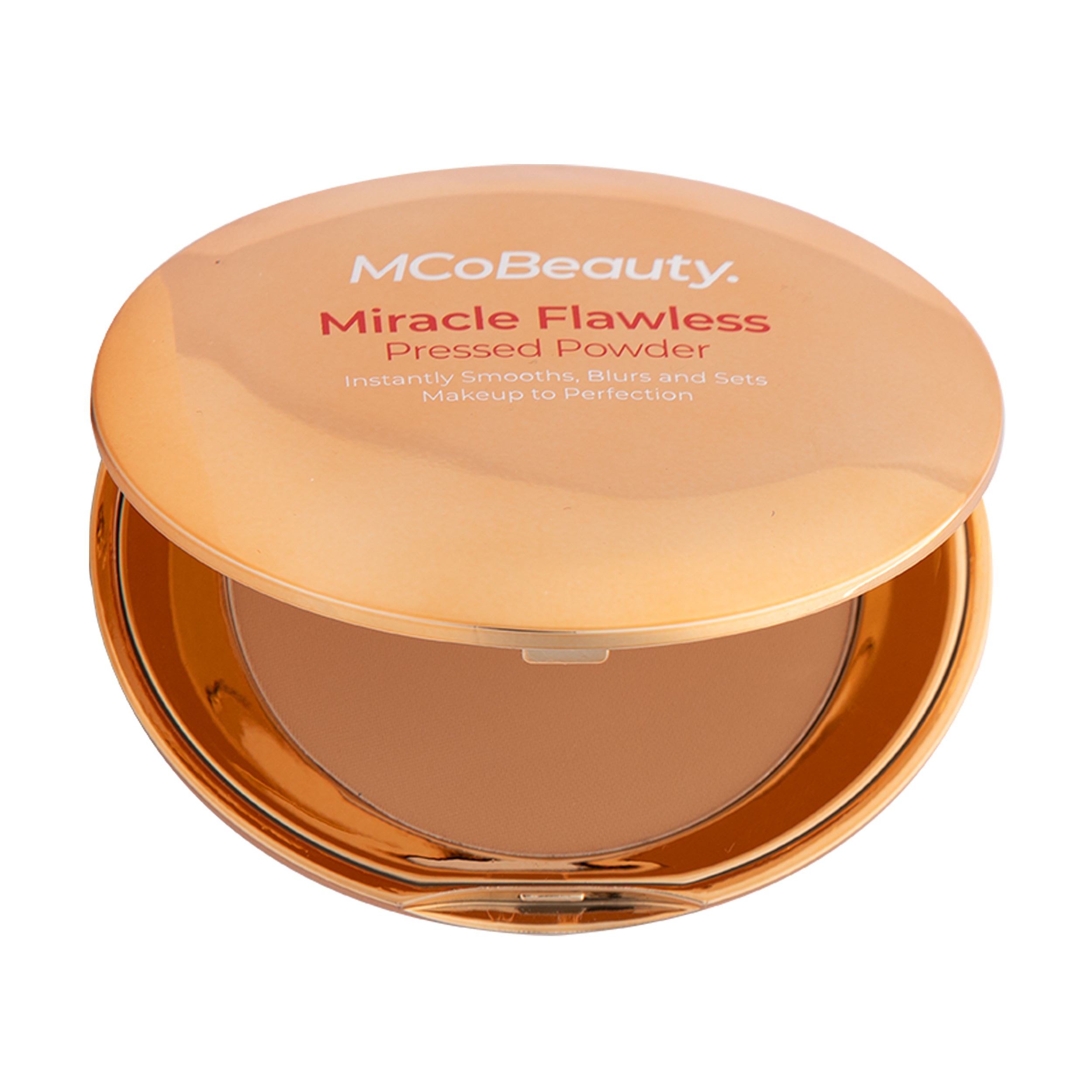 MCoBeauty MIRACLE FLAWLESS PRESSED POWDER is an ultra-fine finishing powder that delivers unbeatable wear to visibly reduce shine with a mattifying effect. Rose Flower Extract and Sweet Almond Oil hydrate and help soothe while a blend of superfine particles double down on smoothing the look of skin texture. pores. fine lines and imperfections. The formula applies a sheer veil of color. without disrupting your products underneath – the perfect complexion enhancer!
