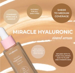 The MCoBeauty MIRACLE HYALURONIC TINTED SERUM is the ultimate blend of makeup and skincare. delivering the hydrating and plumping benefits of a serum with the skin-perfecting coverage of a foundation. This lightweight. buildable foundation glides on effortlessly to instantly blur imperfections. conceal redness and smooth uneven texture.