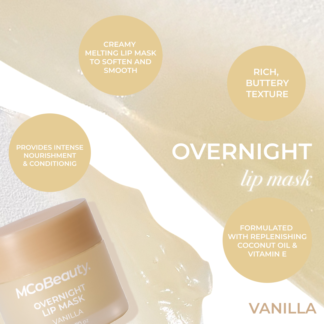 MCoBeauty OVERNIGHT LIP MASK does all the work while you can catch up on your beauty sleep. This rich. butter-like hybrid lip mask is deeply nourishing. acting as a protective barrier against dryness and chapped lips. Formulated with Coconut Oil and Vitamin E to help hydrate. smooth and soften lip lines for a fuller and plumped-up looking pout. Apply during the day as a balm for hydrated. healthy looking lips or to prepare your pout for your favourite MCoBeauty lip product. Double up on application before bed. for a deeply nourishing and conditioning lip treatment. Deliciously scented. you will want to apply this product all day and all night!