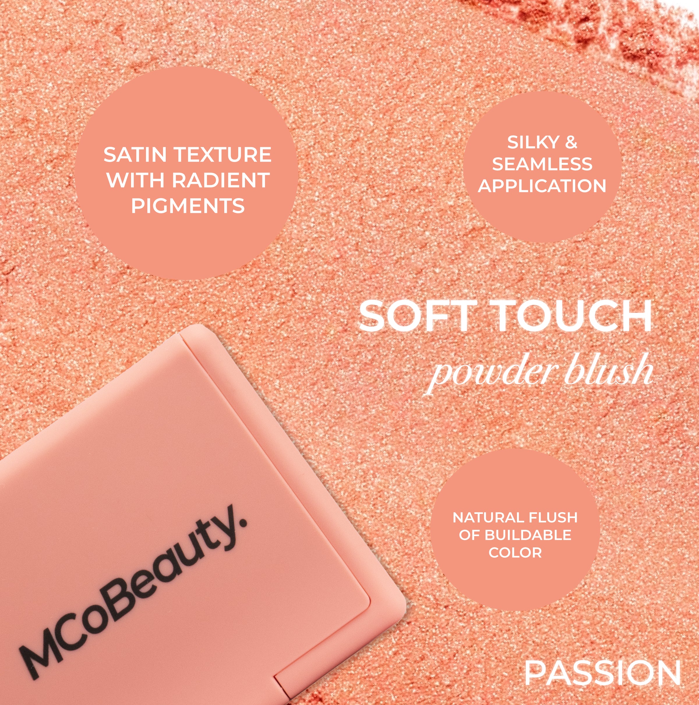 MCoBeauty SOFT TOUCH POWDER BLUSH is a silky pressed blush formulated with super-fine yet ultra-rich pigments. It layers and blends beautifully. giving you complete control over the color payoff. Start with a delicate wash of color or build it up for a bold look.