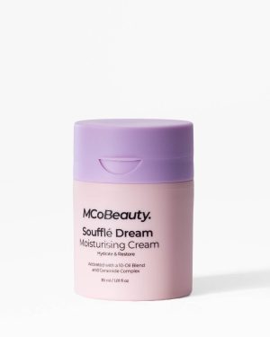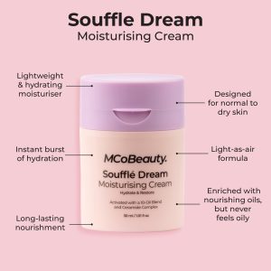 MCoBeauty SOUFFLE DREAM MOISTURIZING CREAM instantly moisturizes while sustaining nourishment throughout the day with its light-as-air and ultra-hydrating formula. The rich formula is soft and refreshing. with a silky and lightweight feel. Ideal for normal to dry skin. this cream will nourish your skin without ever making it feel oily. Made without nasties and enriched with skin-loving ingredients. this moisturizer can be used on its own or mixed with other serums and oils.