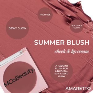 MCoBeauty SUMMER BLUSH CHEEK & LIP CREAM is a light-as-air multi-use cream blush that instantly melts onto skin for an effortless wash of dewy colour. This easy-to-blend creamy formula leaves cheeks with a radiant and enhances lips with a subtle hue. Perfect for layering. apply once for a sheer. subtle flush or build for an impactful look. With a range of ultra-flattering shades. unlock summer’s secret to a sunlit glow.