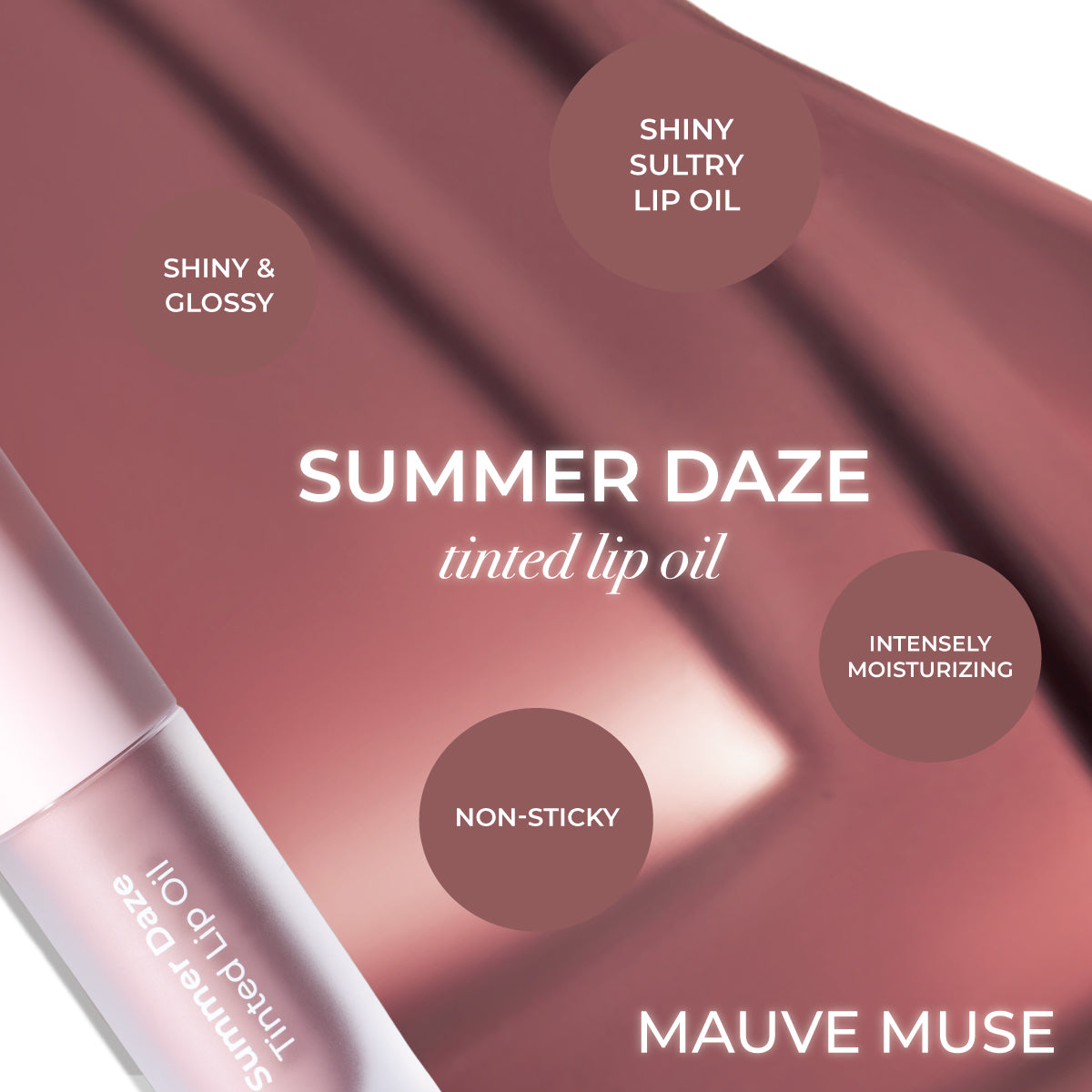 MCoBeauty SUMMER DAZE TINTED LIP OIL is a cocktail of antioxidant rich oils that deposits a light tint onto lips to accentuate your natural lip color. This super nourishing. non-sticky gel-oil formula. melts instantly upon application for a surge of deep moisture. improving lips texture. Featuring an ultra-plush doe foot applicator that hugs lips for a sheer wash of color with a mirror shine effect. Your dream lips are perfectly glazed. always!