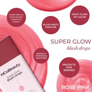 MCoBeauty SUPER GLOW BLUSH DROPS give an instant wash of color boosted with supportive skin loving ingredients. The concentrated and protective formula nourishes the skin while fighting free radicals. adding a naturally radiant flush to your complexion. Buildable and effortlessly blendable. this lightweight skincare-makeup hybrid works on its own or mixed with your favorite MCoBeauty skincare products. Enriched with essential fatty acids. soothing free radical fighters and a sheer flushed tint. a healthy and radiant glow has never been easier.