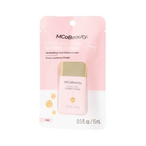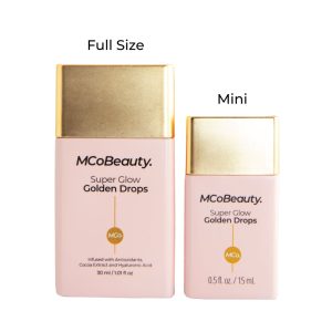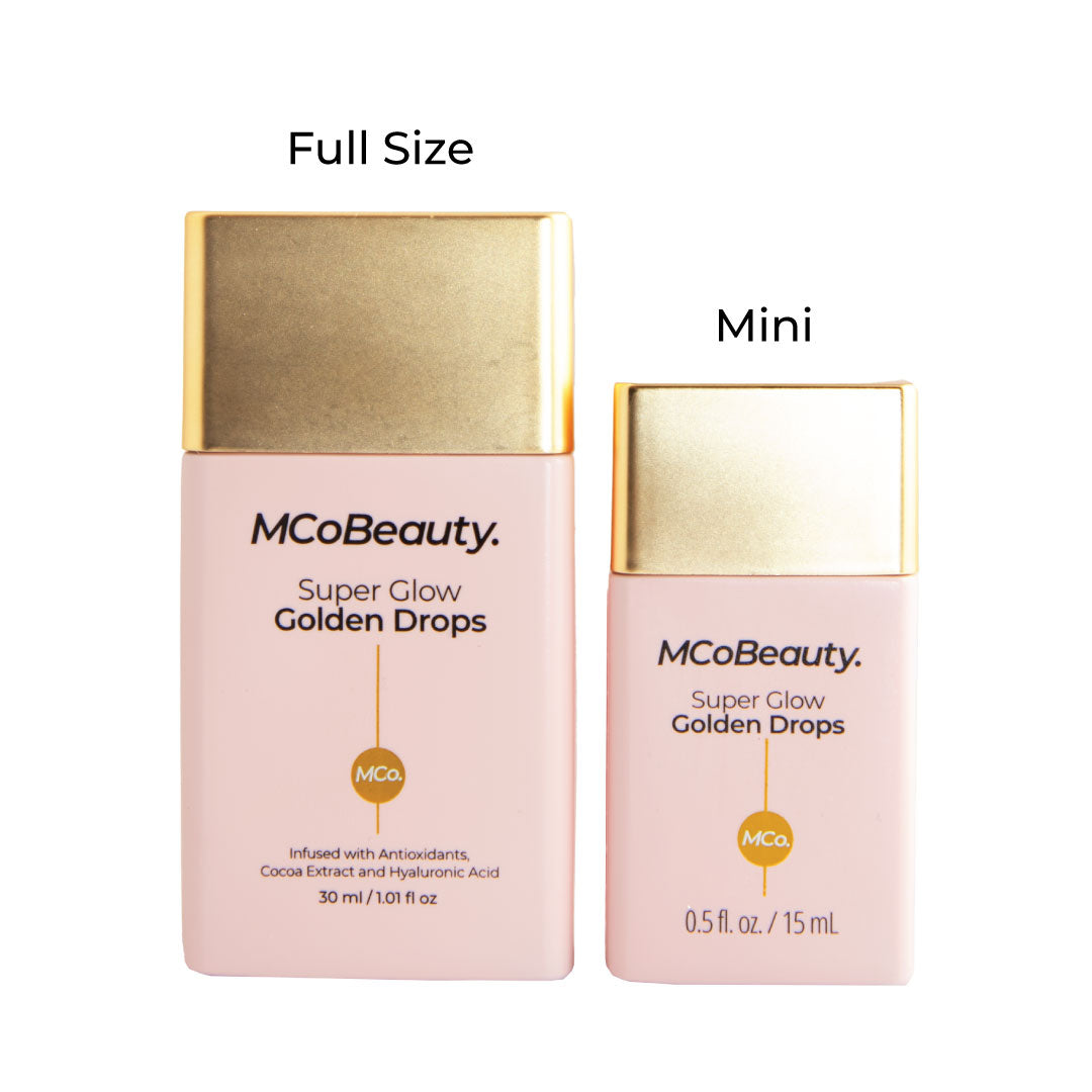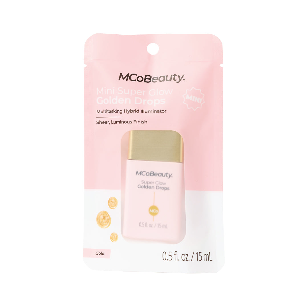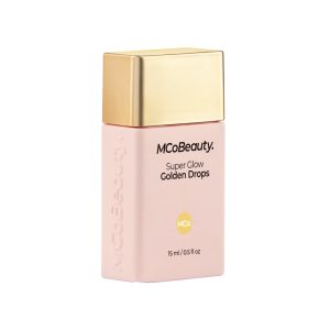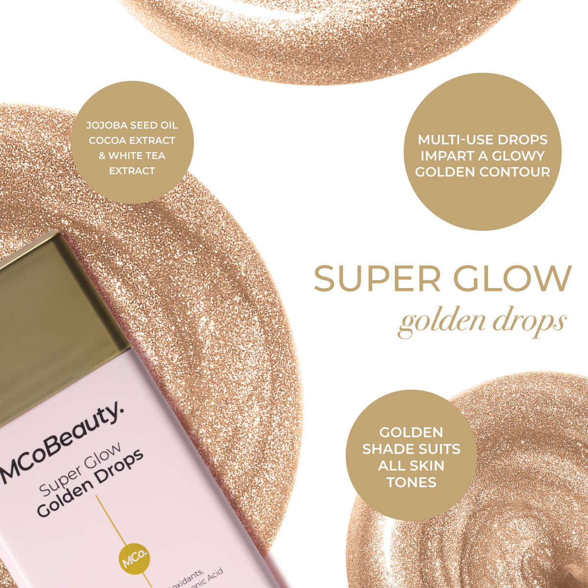 MCoBeauty SUPER GLOW GOLDEN DROPS deliver a smoother. more radiant complexion with every drop. This multitasking liquid luminizer. supercharged with skincare benefits. is your daily makeup essential. Enriched with a powerful blend of skin-loving ingredients that features Niacinamide to reinforce the skin barrier and even out skin tone. Hyaluronic Acid and Cacao Extract to brighten and soothe. plus Jojoba Seed Oil and Squalane to moisturize and nourish for a healthy looking glow. Ultra-fine shimmer pigments provide a sheer natural radiance to revive the look of dull skin. This highly concentrated formula can be worn alone. mixed into your favorite MCoBeauty skincare or base makeup products. or even as a highlighter on top of your makeup.