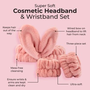 MCoBeauty SUPER SOFT COSMETIC HEADBAND & WRISTBAND SET is your ultimate accessory for skincare and makeup application. The comfortable headband has a wired bow. perfect for holding your hair back and away from your face whether you are applying your makeup for the day or removing it at the end of the night. The soft and stretchy wristbands are perfect for keeping your arms dry while you cleanse your face. making this the ultimate self-care set.